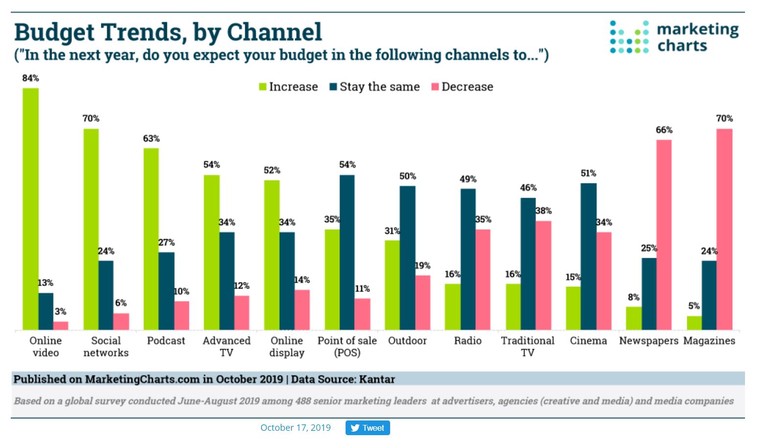 Here is how budgets may shift in 2020. Digital will continue to grow while traditional media may struggle. I believe in video, CTV | OTT for local advertising the best of digital and traditional.
