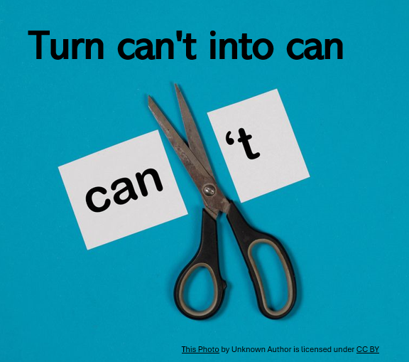 Finally, I responded, "Drop the T." He looked confused and asked, "What does that mean?" I explained, Change can't to can, because you can do these things. It seems like this is more of a situation of won't."