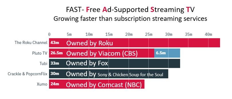 They are all in streaming- ABC, CBS, NBC, Fox all own Free Ad-Supported Streaming TV services. While services like Hulu, Disney, Netflix, HBO Max, ESPN +, Peacock (they do offer a free version) get most of the attention, FAST are growing even faster.