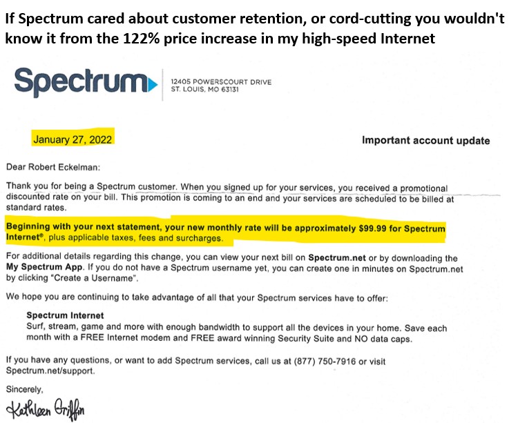 If Spectrum cable cared about customer loyalty, retention, or cord-cutting you wouldn't know it from the 122% price increase in my high-speed Internet. Well, it is actually not an increase, I canceled them today and picked up Frontier FIOS $45 per month or savings me $660 per year and costing Spectrum $900.