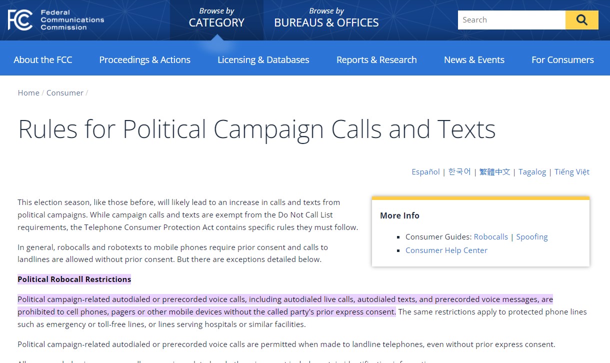 Take a look at the graphic from the FCC, you will see Political Robocall Restrictions