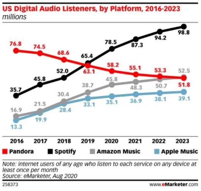 Digital music services by monthly listeners (YoY growth) according to eMarketer: