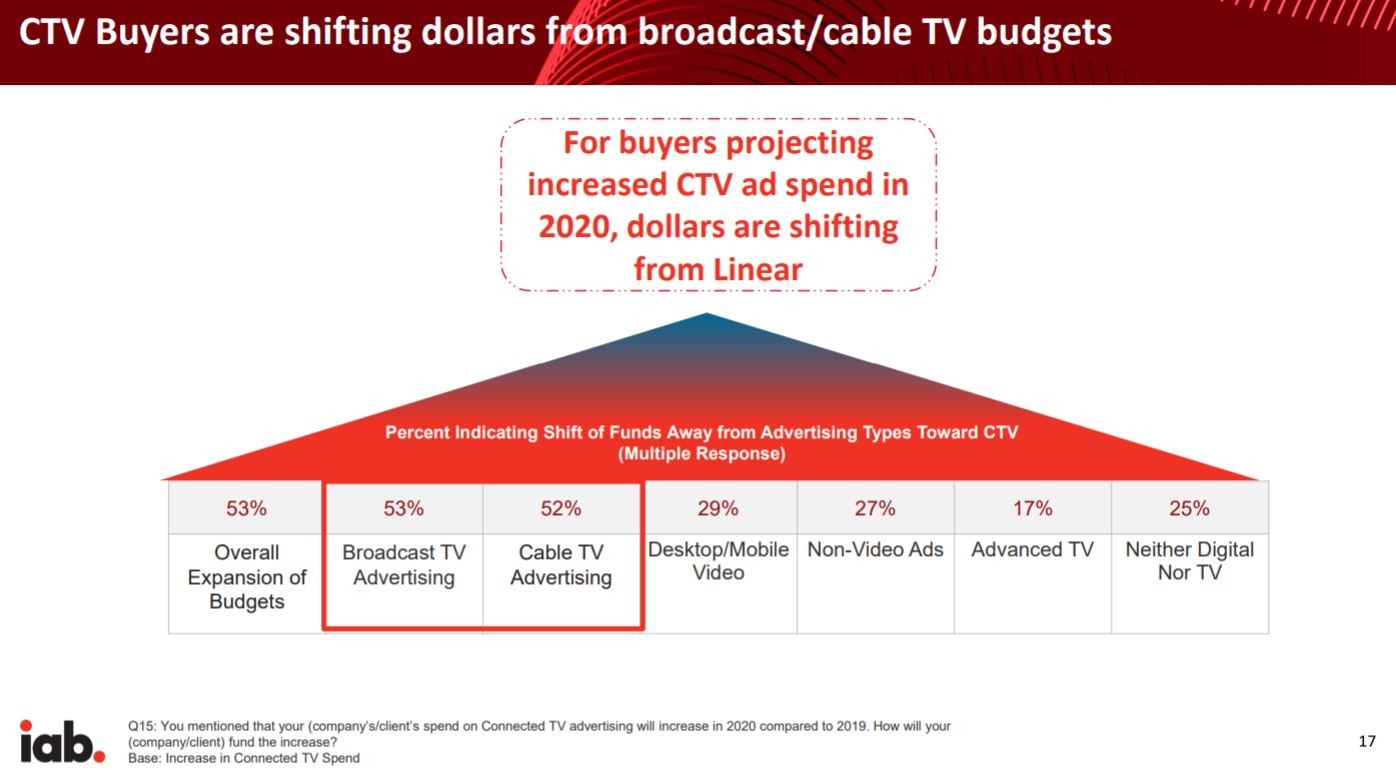 1. More than half of buyers are shifting dollars from Broadcast (53%) and Cable TV (52%) advertising towards CTV