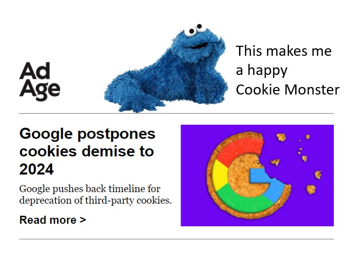 Google's plan to kill the cookie is delayed again. It appears the demise of cookies will not happen until Q3 or Q4 of 2024. I am one happy cookie monster.