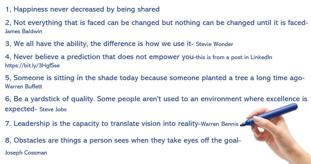 7. Leadership is the capacity to translate vision into reality-WarrenBennis 8, Obstacles are things a person sees when they take eyes off the goal-Joseph Cossman