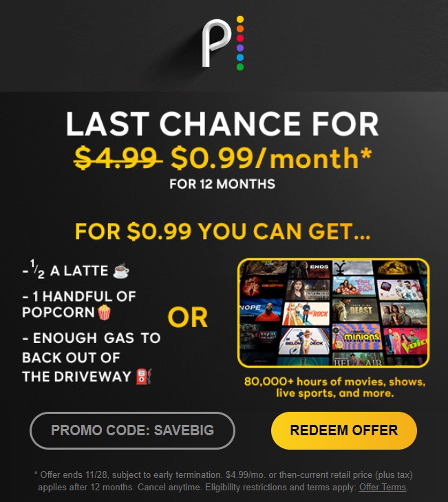 Here's a great offer, one that if I didn't already subscribe, I would not be able to pass up. Peacock 99 cents per month. FANtastic #CTV...