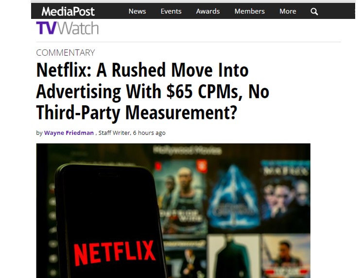 They also announced opening bids for advertising with CPM's at $65. This is about double the normal CPM for top-notch CTV providers. While not lacking confidence in the CPM, Netflix is lacking in other areas such as audience targeting and measurement. Apparently, Netflix has already stated they will provide limited audience targeting and no 3rd party measurement for advertisers.