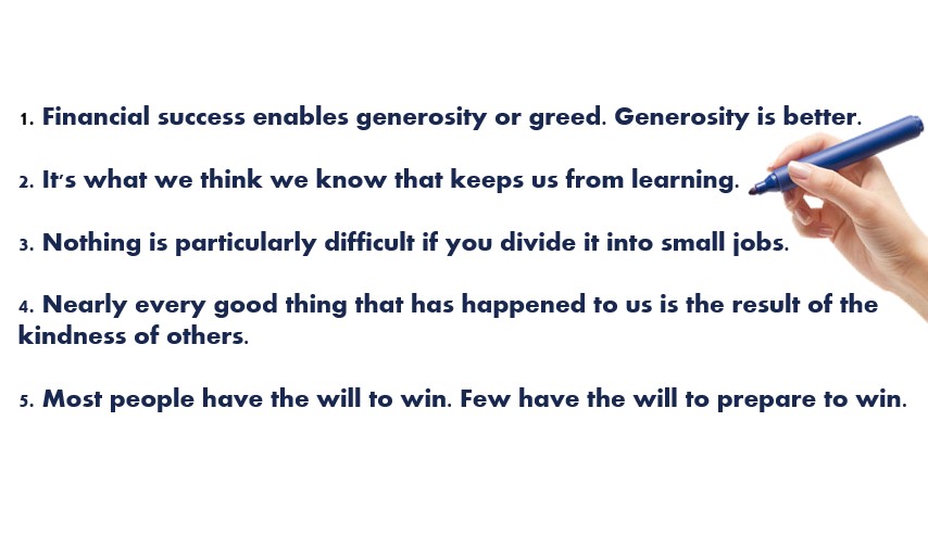 1. Financial success enables generosity or greed. Generosity is better. 2. It's what we think we know that keeps us from learning. 3. ...