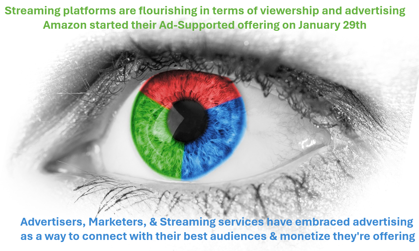 Streaming platforms are flourishing in terms of viewership and advertising Amazon recently joined the ad game on January 29th, if you're interested in advertising on Amazon prime let's talk. Before Amazon went live with advertising it was Netflix's in 2022. Max, Paramount+, and Peacock have also been in the advertising game for several years. It's clear that streaming services end advertisers have embraced ads as a way to monetize and connect with their vast audience. As they say advertisers and marketers follow the eyeballs.