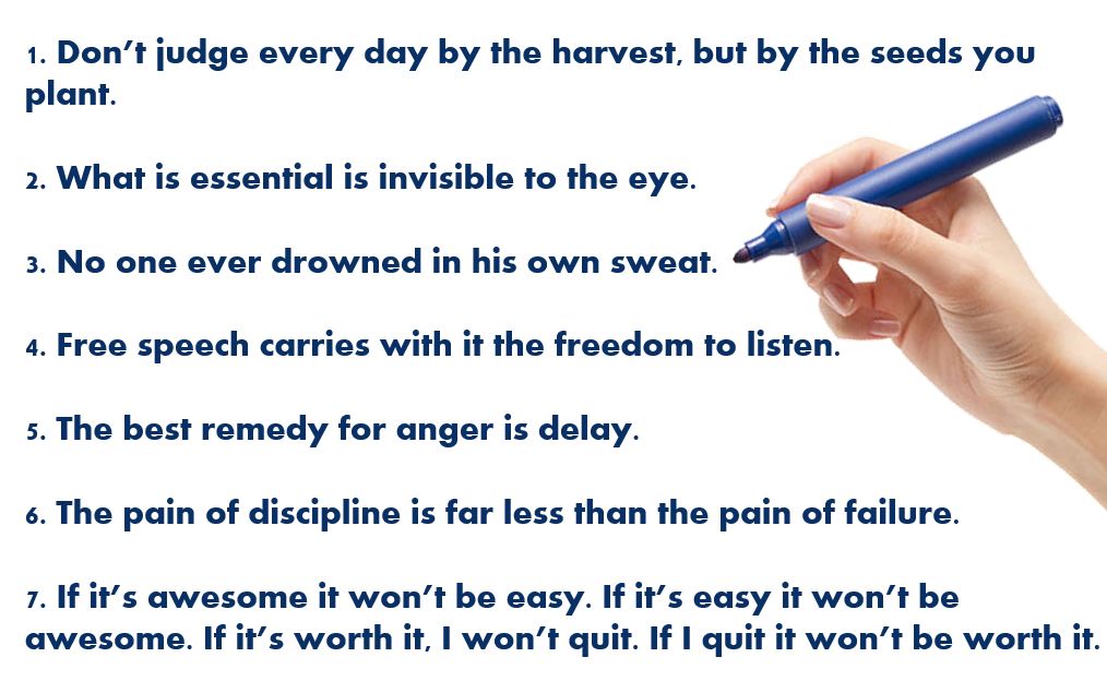 1. Don’t judge every day by the harvest, but by the seeds you plant. 2. What is essential is invisible to the eye. 3. No one ever drowned...