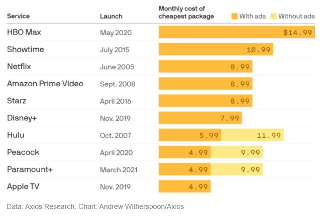 Chart from Axios full article here https://bit.ly/389ZOZ0 Paramount+, Disney+, Discovery+, NBCUniversal's Peacock, AT&T's HBO Max, and...